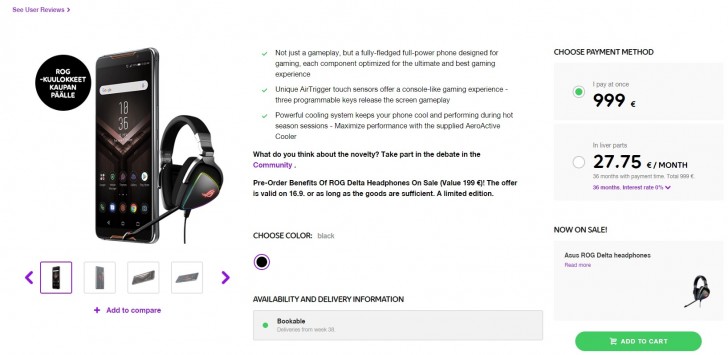 The telecom, Telia is already taking pre-orders for the ROG Phone with a price tag of €999 or €27.75 per month. The device comes with one of ROG Phone's accessories - the ROG Delta Headphones that are usually worth €199, making it a sweet deal.