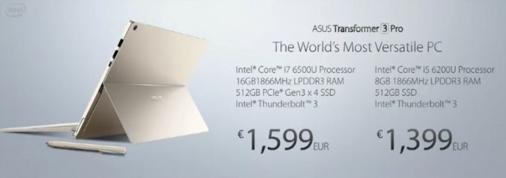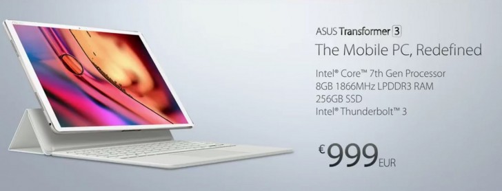 Asus also announced the pricing of their Transformer 3. It has a 7th-gen Intel Core i5 CPU, up to 8GB of RAM (4GB is standard) and a 256GB of SATA3 m.2 SSD (512GB max).