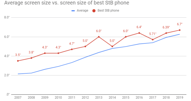 A 1mm bezel on a 5” screen looks average, on a 6+ screen it starts to look razor thin. And it’s not just looks either, it’s how the math works out too. In fact, all the top phones (in terms of StB ratio) have larger than average displays. The table below proves it.