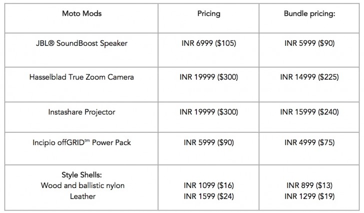 The Moto Z is priced at INR 39,999 ($601) and the Moto Z Play at INR 24,999 ($376). The prices for the Moto Mods are as below. The bundle pricing comes into effect when they are purchased alongside either of the phones.