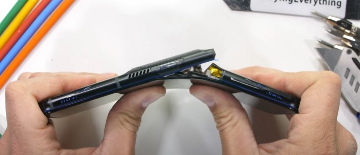 And then... it simply snaps in two when bent, much more readily than the ROG Phone 5. The antenna lines on the sides are the weak spots, and they're symmetrically placed on either side, which makes the tearing quite easy. There are more antenna lines on the other side of the center camera hump, and sure enough, it's easy to snap there too. In the end, the phone is reduced to three parts. The front glass is still intact, though.
