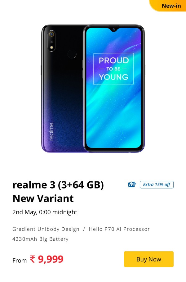 The regular Realme 3 now comes with double the storage at 3GB + 64GB for INR 9,999. Its flash sale will happen on May 2 at midnight.