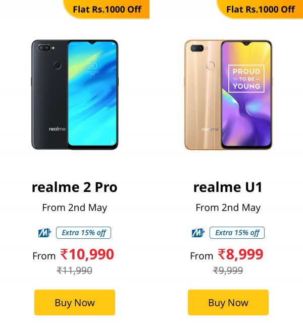 The Realme 2 Pro and Realme U1 will get a INR 1,000 discount on May 2 and will be priced INR 10,990 and INR 8,999, respectively.