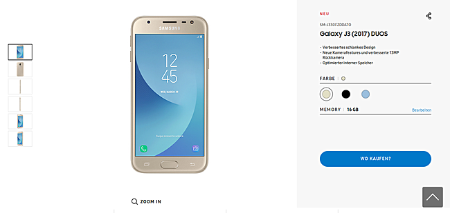 The Samsung Galaxy J3 (2017) has landed in Europe, over a month after it was made official. The dual-SIM model is now listed on the South Korean company's Austrian website. The listing reveals color options including gold, black, and blue.