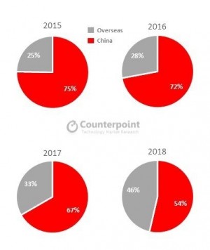 Counterpoint, on the other hand, showcased an increasing trend of Chinese companies expanding outside their domestic market. The so-called HOVX (Huawei, Oppo, vivo, Xiaomi) increased rapidly its overseas shipments' share and from only 25% sold in 2017 it reached 46% in 2018. .